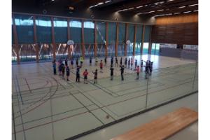 - Le revêtement de sol est beaucoup trop clair et le marquage au sol très peu visible. Seuls les spectateurs du 1er rang ont une vue globale du terrain. Dommage pour une salle neuve.